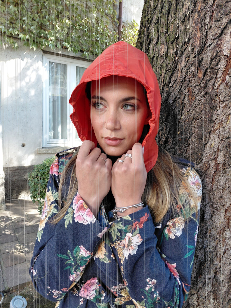 -I laccetti in cotone permettono di aderire la parte davanti del cappuccio al tuo volto, comodo per quando c'è vento oltre la pioggia.